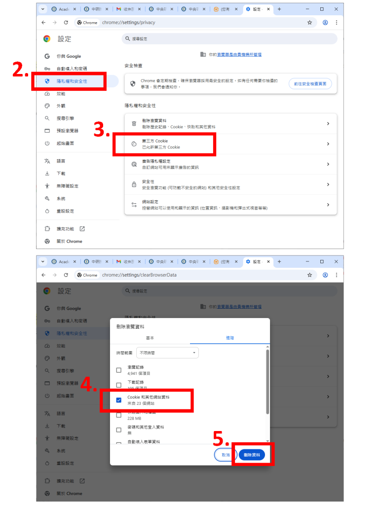 敬請將瀏覽器的Cookie紀錄清除,即可重新瀏覽統計所官網,操作流程參考下列說明。如有異常問題,逕洽資訊室 張文瑜(分機429,信箱cindy(a)stat.sinica.edu.tw)。 文章導覽網域名稱申請及管理說明 ASAI服務平台